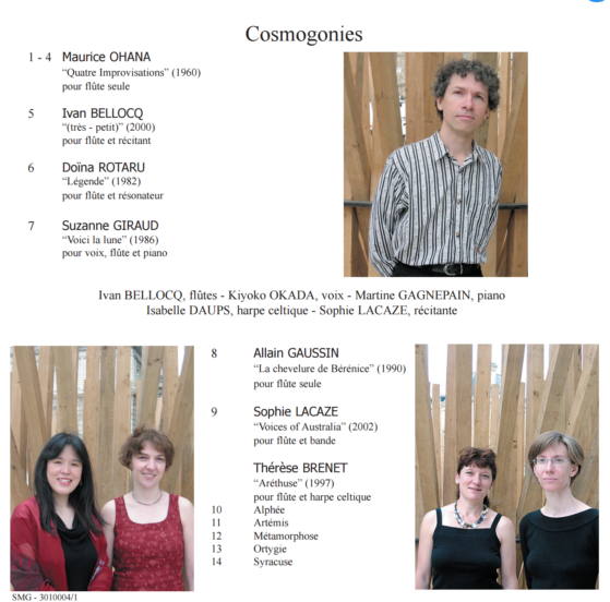 Cosmogonies Galun Records, 2005 Oeuvres :« Voices of Australia »et oeuvres de Maurice Ohana, Thérèse Brenet, Suzanne Giraud, Allain Gaussin, Doina Rotaru et Ivan Bellocq. Interprètes:Ivan Bellocq, flûte Autres interpètes du CD :Kiyoko Okada, voixMartine Gagnepain, pianoIsabelle Daups,harpeSophie Lacaze, récitante