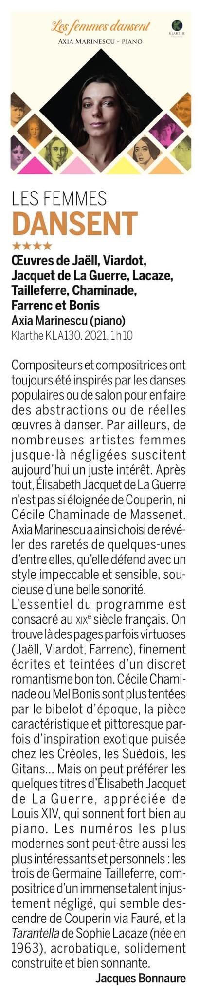 ‘ … les numéros les plus modernes sont peut être aussi les plus intéressants et personnels: les trois de Germaine Tailleferre, … , et la Tarantella de Sophie Lacaze, acrobatique, solidement construite et bien sonnante. ’