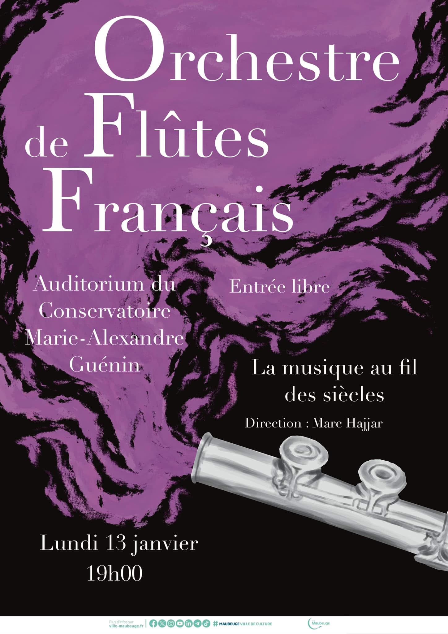 And Earth moves away Concert 13 janvier 2025 Conservatoire, Maubeuge, France Quatuor de l'Orchestre de Flûtes Français La musique au fil des siècles.Dimanche 7 avril à 15h30.Oeuvres de LACAZE, BACH, FELD, GAUTHIER, CHAMINADE, CLARKE.