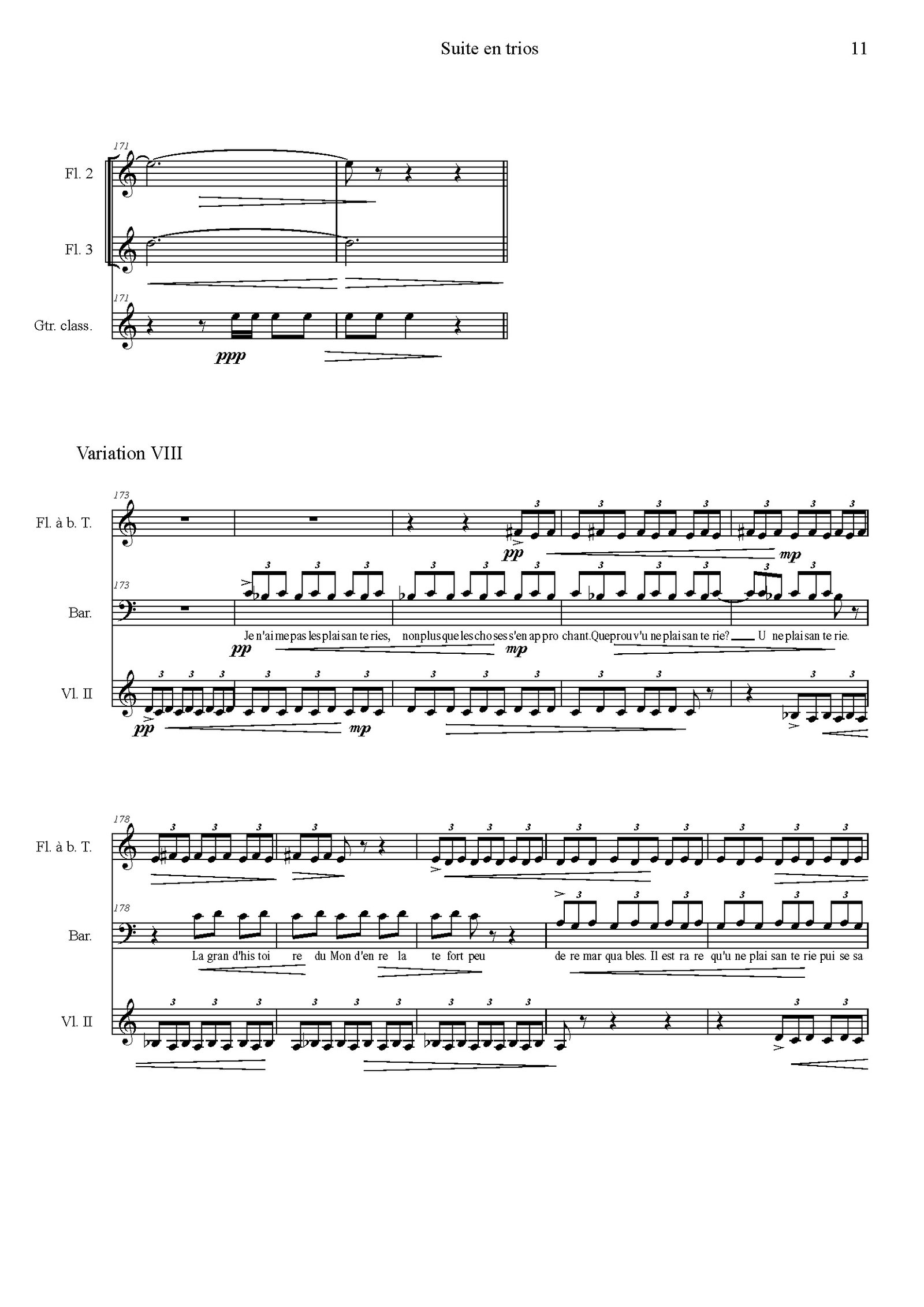 Pour / for: 2 flûtes traversières, 1 flûte à bec ténor, 1 basson, 2 trompettes, 1 baryton, 2 violons, 1 violoncelle, 1 guitare / 2 flutes, 1 recorder, 1 bassoon, 2 trumpets, 1 baritone, 2 violins, 1 cello, 1 guitar